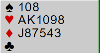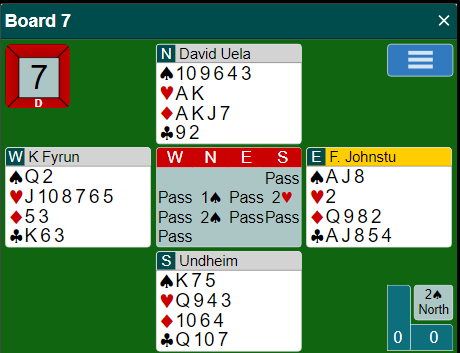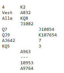 Ved begge bord sa syd pass som selvsagt er korrekt nok, og vest meldte simpelthen det han trodde stod, 4 hjerter. Uavgjort spill da begge fikk elleve stikk.