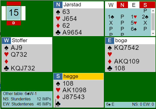 Med hjerter ut fra nord var alt håp ute, det måtte stjeles hos øst og nord hadde to sikre trumfstikk. Med +50 for en bet ved det bordet og vunnet slem ved det andre ble det 14 IMP til Studentenes BK 3.
