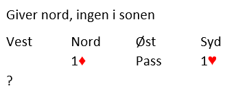 La oss si du passer i åpning. Vest åpner med 1 kløver, pass fra nord og øst sier 1 hjerter som viser minst fire spar (kløverføringer).