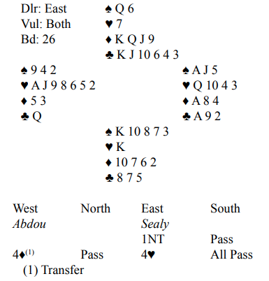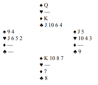 Syd spilte ut en ruter til nords knekt, og spillefører lasjerte. Fra nord kom kløver konge til esset. Så trumf dame til kongen og esset fulgt av en spar fra bordet. Nord la liten spar som normalt er riktig med damen dobbel - lavt i andre hånd - men her ble det kostbart. Esset vant stikket og ruter ess og ruter til stjeling fulgte, så en trumf fra bordet. Nå begynte nord å se hvor det bar. Hvis han ikke kaster spar dame vil spillefører trumfe to kløver, så er alt eliminert unntatt spar og trumf hos Ø/V, og nord blir innspilt på spar dame. Posisjonen blir omtrent slik: