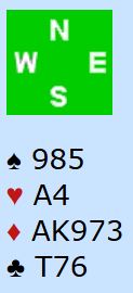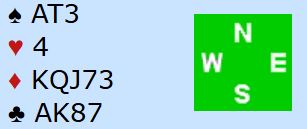 Vest er giver og ingen i sonen. Det går pass fra vest og nord før øst åpner med 1 hjerter. Melder du inn 2 ruter eller blir det pass? Igjen dreier det seg om et meldestilspørsmål. Mange liker å ha sekskorts farge for å gå inn på to-trinnet, eller hvis det bare er femkorts farge ha skikkelig åpning, eller bedre fordeling enn dette. Men ganske mange melder vel inn ganske automatisk med slike kort.