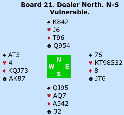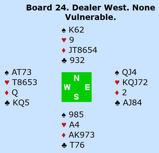 Siden sparfinessen ryker for dem som spiller hjerterkontrakt blir det tre tapere i hjerterkontrakt. Å spille 4 hjerter med ti stikk ga 55% til Ø/V, og det skjedde ved de bordene syd ikke meldte inn så det ikke ble noen mislykket stamp. Men mislykkede stampemeldinger kan fungere av og til om motparten gjetter feil og melder videre. Det skjedde ved en del bord hvor Ø/V gikk på til 5 hjerter over 5 ruter, og da fikk N/S inn en søt +50 som var verd 79 %. Noen åpnet med vests kort, og da ble det vanskelig for øst å ikke melde 5 hjerter, enten etter et slemforsøk eller om N/S kom med og meldte 5 ruter. Det var også ett par som havnet i 6 hjerter selv om de manglet to ess.