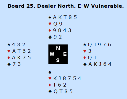 Whibley kom altså i 4 spar som nord doblet. Doblingen hjalp antagelig øst litt i spilleføringen. Ved en rekke bord var 4 spar kontrakten og ingen andre enn Whibley vant den. Ruter ut fra syd var ikke det beste for motspillerne. Han vant med damen og tok to store kløver. Så avblokkerte han ruter knekt før han spilte hjerter til esset. To store ruter tok stikk da nord hadde fire av den sorten og syd ikke hadde trumf! Trumfsitsen var dermed klar og en hjerter ble stjålet. Dermed hadde spillefører åtte stikk og måtte få to trumfstikk til. Kontrakten ville blitt vanskelig å vinne med hjerter ut.