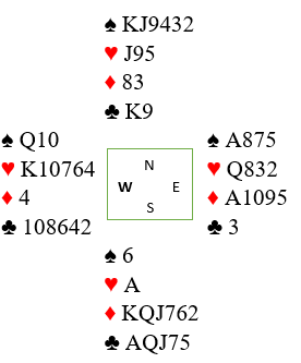 Øst spilte ut sin single kløver og ba kanskje en stille bønn om at blindemann (syd) ikke skulle komme ned med renons i spar. Han ble bønnhørt på det.