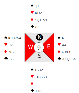Det ble to bet i 4 hjerter doblet, -300. Og Ø/V har faktisk ti stikk i grand siden vest har spar konge og kløver knekt som inntak til å hente det stikket. Så i teorien kunne Ø/V ha meldt 4NT. Maksimalresultatet på spillet - i teorien - er derfor at N/S stamper i 5 hjerter over 4NT og går tre bet, -500.
