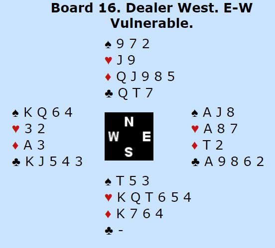 Syd spilte ved de fleste bordene ut sin single hjerter. Mange vant hjerterutspillet med damen og spilte ruter til kongen og esset. Derfra kom hjerter til stjeling, Nå er spillefører i trøbbel og fikk vanskeligheter med å både få tatt kløverfinessen som for så vidt løser den fargen enkelt, og i tillegg tatt to sparfinesser. Slik det gikk var det mange som gikk en bet, og noen gikk to bet i denne normale utgangen.
