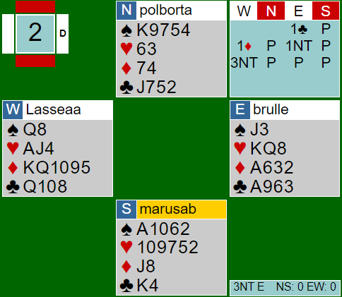 Hvis øst åpner med 1 ruter har vest til omvendt minor (2 ruter som krav). Etter det er det for mange stoppervisning for å finne ut om 3NT er bra, men med slike kort som øst har bør han si 2NT etter min mening, selv med knekten dobbel i spar. Da blir det 3NT ut av det. Om de starter med 1 ruter-2 ruter og tenker for mye (er litt for "clever") kan de rote seg i 5 ruter. Men som du ser står ikke verken 3NT eller 5 ruter denne gangen om da ikke det er en av miraklesitsene i kløver, og det gjettes på hvilken. At det ikke står i 3NT er i teorien. I praksis står mye oftere 3NT enn 5 ruter! For eksempel er det ikke sikkert han som skal spille ut har et opplagt sparutspill.