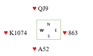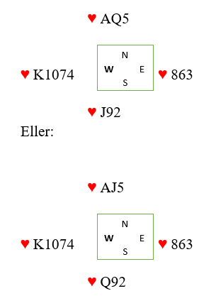 Selvsagt kan det være så enkelt at hjerter ess sitter foran, men la oss si du pga. meldingene tror mest på at esset sitter bak selv om det kanskje er en liten mulighet for esset foran (i så fall sitter antagelig både damen og knekten bak). Du tror altså esset sitter bak. Da kan du spille liten til tieren og håpe både dame og knekt sitter foran, men bedre sjanse er det å spille på at enten damen eller knekten sitter foran sammen med nieren. Med andre ord at det sitter omtrent slik: