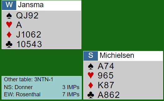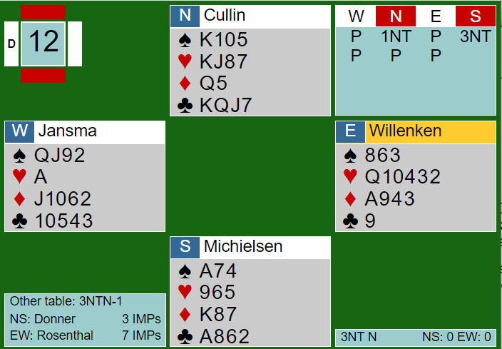 Ved det andre bordet kom også vest inn i første stikk på hjerter ess. Men Donner skiftet til liten ruter som fungerte mye bedre selv om det like gjerne kunne være det skiftet som forærte spillefører stikk. Men slik var det ikke, DONNER noterte +100 for en bet, og det ble 12 IMP ut for det «norske» laget.