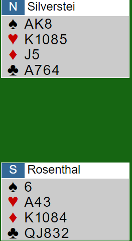 Ved det andre bordet lasjerte Rosenthals spillefører Silverstein sparutspillet og stakk neste spar. Så spilte han seg over til syd på hjerter ess og dro kløver dame. Men da det førte til at det ble en kløvertaper til østs 10-9-5 var det for sent å godspille det niende stikket. En bet og +100 til DONNER ga dem ytterligere 12 IMP. Det norske parets lag, uten nordmennene "på banen" altså, tapte de første femten spillene med 8-27. Hengende litt bakpå ble det noen flere IMP i de neste settene, og til slutt tapte de kampen med 66 IMP (167-101).