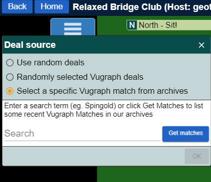 Du kan så velge «random deals» og får spille helt tilfeldige spill. Du kan også klikke «random vu-graph deals» som gir en fil med spill som forekom i en eller annen tilfeldig kamp som tidligere har blitt overført på BBO. Jeg liker å buke «specific vu graph deals» som du ser jeg har klikket på her, og så skrive inn for eksempel Bermuda Bowl i "search". Da får du valget mellom forskjellige mesterskap fra tidligere år.