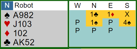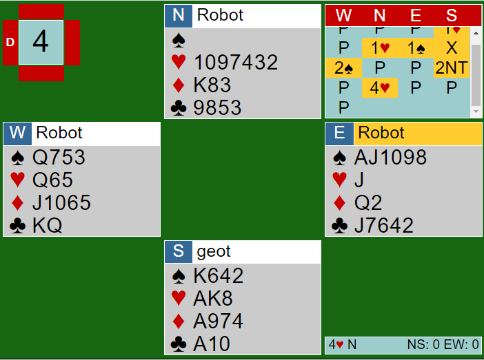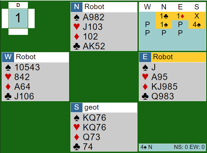 Når en spiller slike turneringer med og mot roboter er det en funksjon som jeg liker, og det er at hver gang du blir blindemann blir du flyttet over på andre siden av bordet og får spille kontrakten. Dermed blir det mye spilletrening. Så idet spillet startet var jeg plutselig på nords plass og fikk spar knekt ut fra øst mot 4 spar.