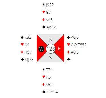 Problemet i spillet hvis du er i 6 hjerter er at det er kun ett inntak til vest så kun en av finessene i de røde fargene kan prøves. Som du ser blir det galt om spillefører inne på spar konge tar trumffinesse, mens hvis han gir opp trumfinessen og senere tar ruterfinesse blir det tolv stikk.