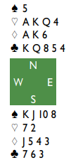 Vest som åpnet har kløver ess, men du har ikke noe inntak til syd for å spille en andre runde kløver mot bordet. Vest kan jo godt ha kløver ess dobbel, i så fall blir det mange stikk om du nå spiller liten kløver fra bordet og esset kommer på. Problemet er at du ikke kan slippe inn øst først hvis du taper to kløverstikk, for spar gjennom gjør at vest kan få satt opp sparfargen før du har fått satt opp dine kløverstikk. Slik satt det: