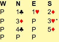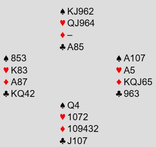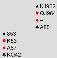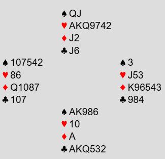 Ved det andre bordet ble det et raskere meldingsforløp. Syd for BAK svarte 1 spar på 1 hjerter. Nord hoppet til 3 hjerter, og syd hoppet til...7 kløver!