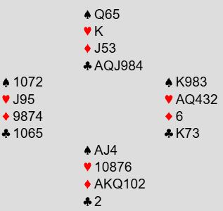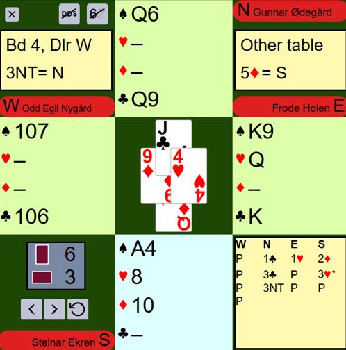 Ved det andre bordet startet meldingene likt til 2 ruter, men nord meldte da 3 kløver, og syd spurte om hjerterstopper med 3 hjerter. Ødegård sa 3NT med sin single hjerter konge.