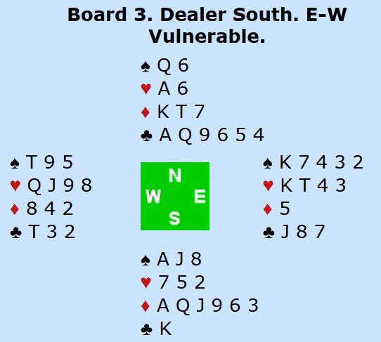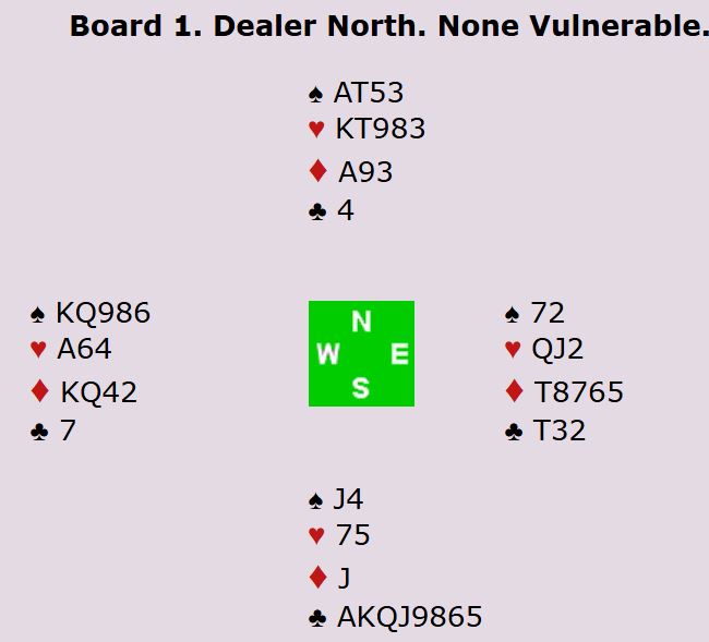 Tolv par meldte 7 kløver, og syv av dem vant den. For å vinne må de gjenværende to trumfene hos nord etter uttrumfing brukes til å stjele god hjerteren, og så må underveis ruter konge presses ut mot trumf for at det skal bli to ruterstikk som gir avkast for syds to spar.