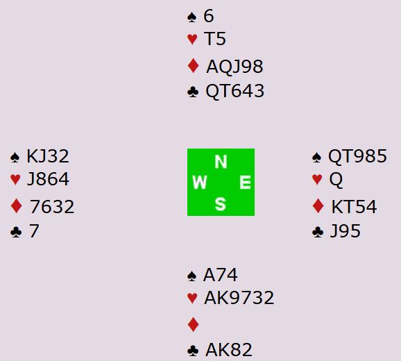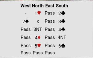 Dette er en meget god kløverslem, og det skal ikke mye til før det blir tretten stikk om det ikke sitter skjevt. Det er egentlig ingen tapere, men med 4-1 i hjerter og kløverknekten tredje hos den med singel hjerter er det ikke så lett å vinne 7 kløver.