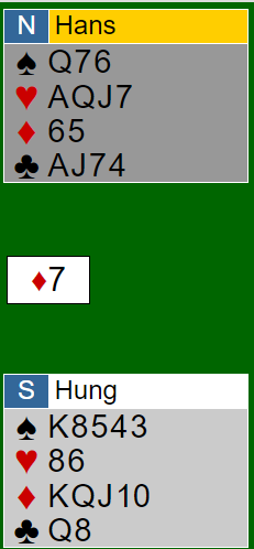 En liten sensasjon i SPINGOLD var det at lag HANS ikke var lungt unna å nå finalen før de ble slått av BREMARK. HANS består av spillere fra Australia samt en spiller fra New Zealand. Halvveis i semifinalen mot BREMARK ledet lag HANS, men mot slutten ble svenskene for sterke og vant til slutt med 35 IMP. Her er et spill fra perioden BREMARK tok kommandoen i den kampen:
