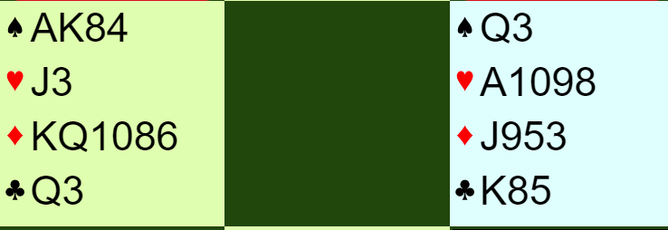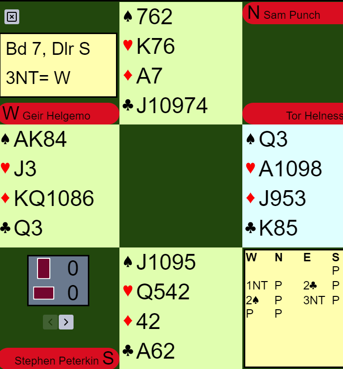 Lars Eide (øst) og fikk hjerter knekt ut fra syd. Han vant med en honnør hos vest og tok for dame-knekt i kløver før han spilte ruter. Nord la i en honnør, øst stakk. Så tok han simpelthen kløverstikkene og kastet spar og ruter fra vest. Så hjerter mot bordet, og han hadde like etter fått fatt i 1+2+1+5 = 9 stikk, +400 og 10 IMP til NORGE.