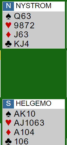 Dette utgangen burde vel være ganske enkelt å vinne på flere måter for mange, og ikke det aller mest spektakulære vi har sett fra den kanten, men det skjedde annerledes enn spillet gikk ved de fleste bordene. Og nesten halvparten av N/S-parene gikk bet, noen av dem bet i 3 hjerter (!), og enkelte gikk to bet i 4 hjerter (for eks. de bommet trumfen med esset først, og bommet også kløveren).