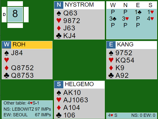 La oss før vi ser på Helgemos spilleplan se hva som skjedde ved det andre bordet med SEOUL sin spillefører i samme kontrakt. (Det tas i fortsettelsen forebehold om at "recordingen" av spillets gang på BBO er korrekt.)