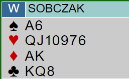 Sobsczak ved det andre bordet hadde helt andre ambisjoner. Direkte over østs 2 spar meldte han 4 hjerter! Det har mye for seg. Hvorfor spille på 5-2 tilpasning i spar når man har en så sterk hjerterfarge?