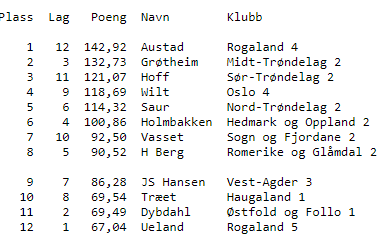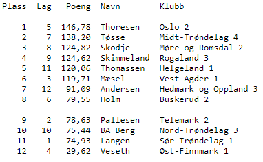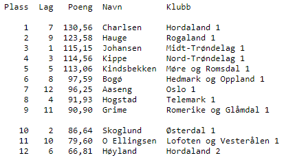 Hordaland/CHARLSEN har grepet på dette, men det er på ingen måte over. De har 5,2 VP mer enn Nord-Trøndelag/KIPPE som sammen med Midt-Trøndelag/JOHANSEN (9 VP bak lederlaget) ser ut til å være de som kan fravriste Hordaland/CHARLSEN gull. Da må det sikres stor seier i egen kamp i tillegg til litt hjelp fra Møre og Romsdal/KINDSBEKKEN som spiller mot lederlaget.