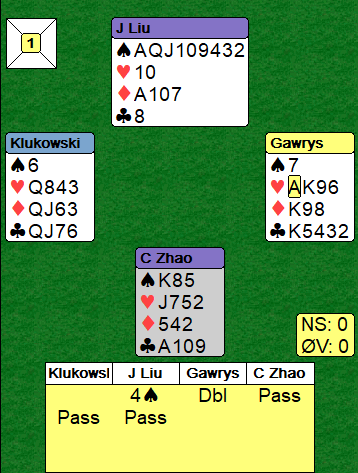Liu på nords plass åpnet med 4 spar med en hånd som vel er klart for sterk for det slik de fleste ser det. Gawrys doblet og det gikk pass rundt. Der var det kun to rutertapere og en hjertertaper, +590 til Kina.