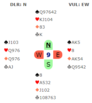 Etter sparutspillet ut tok Geir kløverfinessen, og pga. av vest hjerter 9 (!) kan ikke forsvaret få tak i mer enn tre hjerterstikk siden nord var inne. Det må to gjennomspill av denne hjerteren hos vest for å få fatt i fire motspillstikk.