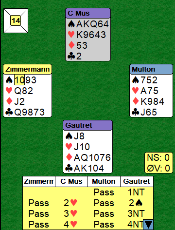 Spillefører fikk dermed kun to hjerterstikk, og kontrakten kollapset fullstendig. Det endte med tre bet og 12 IMP til Zimmermann.