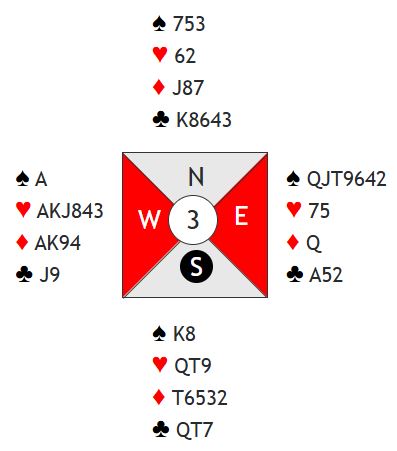 Lilleslem i hjerter er bra, men lilleslem med spar som trumf er antagelig bedre. I sparkontrakt gir vests to store rutere avkast for østs småkløvere. Selv om det kommer kløver ut blir det i sparkontrakt - om det ikke sitter veldig skjevt i ruter - kun ett trumfstikk til N/S for sparkongen. 6 hjerter har også bra sjanser, men det kan gå galt om hjerteren sitter skjevt, og det må også sørges for å bli kvitt den fjerde ruteren og kløver 9. To kløver kan kastes på ruterhonnørene i 6 hjerter også, så kan en kløver trumfes hos øst, men det er som nevnt også en liten ruter igjen som det må finnes parkering for. Slik det satt bør imidlertid slem både med spar og hjerter som trumf vinnes, men hvordan melde slem? Og hva bør vest åpne med?