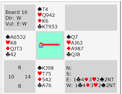 Øst sin kortvurdering er ikke bra etter min mening, men det er litt stilspørsmål. Han viste 15-17 med 14 relativt flate, ikke noen femkorts farge og ikke en gang en tier. Og 3NT var en temmelig shaky kontrakt, avhengig av at begge de røde finessene lykkes pluss feil i motspillet. Det fungerte likevel siden det ikke ble funnet noen "sus opp"-variant i kløver.