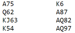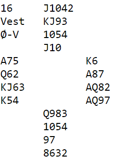 Det har noen fordeler at det åpnes med 1 ruter selv med balansert hånd, men det er ingen tvil om at den moderne stilen hvor ruteråpningen viser ubalansert hånd gir noe ekstra også. Selv om det spilles slik at disse vest-kortene tilsier åpning med 1 kløver bør vel Ø/V kunne finne frem til 6 ruter?