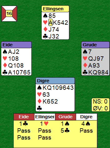 Her var forslaget mitt et glimrende motspill, nord skulle spille tre runder hjerter så en av østs vinnere i den fargen kunne bli trumfet bort selv om vest kan trumfe over. Som mange har oppdaget er det svada, syd har jo ikke trumf! Beklager til leserne, og beklager til Ellingsen som ikke kunne gjøre noe for å bete den 5 kløveren i tredje stikk. (Men kontrakten kunne gått bet med ruterskift i andre stikk.)