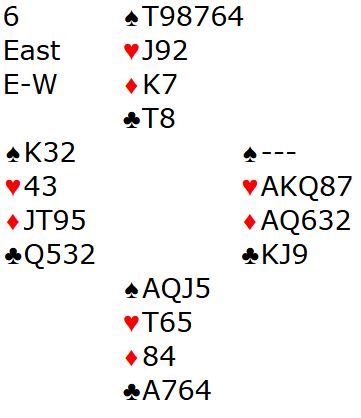 Slik det satt stod det tolv stikk på rutefinessen og en del til. En må jo over til vest for å tatt trumfinsessen. Det kan ikke ikke sitte 5-1 i kløver, da kan de få for kløver ess og en stjeling. Dessuten er det altså ikke noe sikkert inntak til vest for å få tatt ruterfinessen. Så muligheten for å vinne slem er langt i fra god nok. Utgangen 5 ruter er riktig kontrakt.