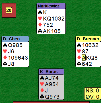 I dagens siste kamp møtte vårt lag lederlaget PEPSI som er en polsk-amerikansk lagkombinasjon. Da så det ut som det skulle bli et stort tap og Norge ville falle litt på listen, men nordmennene fikk inn noen IMP mot slutten av kampen. I det aller siste spillet meldte Brogeland-Lindqvist en fin slem: (Norges kamp ble ikke overført på BBO, så bildet av diagrammet er fra en annen kamp) .