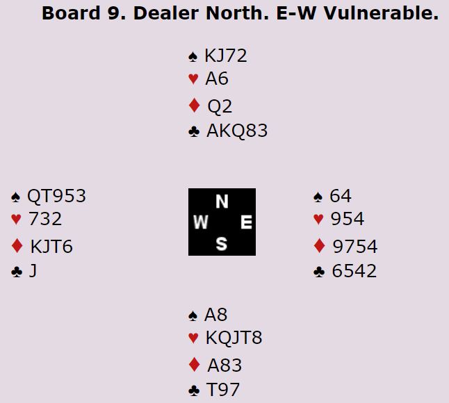 Siden kløveren går er det tretten stikk. Det er dog ikke så enkelt å finne ut at det er så perfekt, og storeslem ble ikke meldt så mange plasser. Det norske N/S-paret meldte 6NT og noterte +1020. Det kan jo noen ganger bli tapt spill når det står i storeslem, men i dag ble det et enormt gevinstspill. Irlands N/S meldte nemlig 6 spar. Den ble doblet, og det kan vel sies at doblingen ikke var helt gjennomtenkt da N/S kunne flyttet til 6NT. Men det ble 6 spar doblet, og den kontrakten gikk fire doblede bet, Norge +800. Sammen med slem med overstikk ved det andre bordet ga spillet hele 18 IMP! (Doblingen ga 3 IMP ekstra)