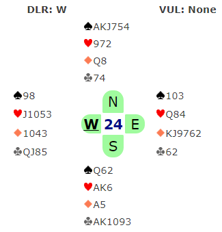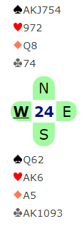 Det er langt i fra håpløst å være i storeslem. Men det er to røde tapere som må dekkes opp, så kløverfargen må gi fire stikk. Pga. kløver 9 og 10 er det ekstra sjanser i tillegg til at fargen rett og slett kan sitte 3-3 slik at to ekstra stikk enkelt kan godspilles med en kløverstjeling.