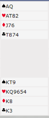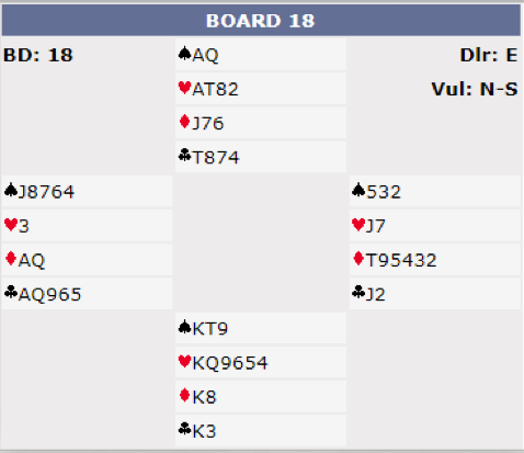 Etter pass fra øst åpnet syd med 1 hjerter. Vest meldte 2 hjerter - Michaels Cuebid (spar + en minor, minst 5-5). Nå sa nord 4 hjerter som jeg mener er feil melding, og for brutalt. Han tenkte nok A-Q i spar var verd litt mer enn 6 poeng hvis syd ikke har kongen (sparfinessen går i så fall veldig ofte), men et såkalt "cueraise" (god løft/invitt) er nok. Det blir i denne situasjonen meldingen 2 spar - innmelderens (viste) farge - på samme måte som om vest hadde meldt inn 1 spar. Uansett, syd har til å ta imot en utgangsinvitt, så 4 hjerter blir kontrakten samme hvordan de melder. Og 4 hjerter ble kontrakten ved nesten alle bordene.