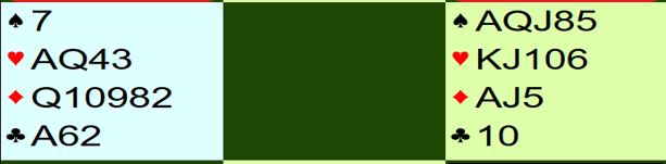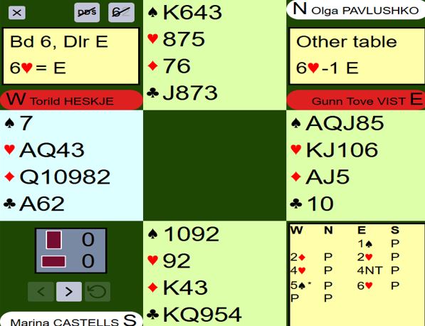 Det er flere måter å vinne 6 hjerter på slik det sitter, men spillefører må være litt forsiktig. Gunn Tove Vist (lag NORDEN) stakk utspillet med kløver ess og stjal en kløver. Så tok hun runder trumf, men lot nord beholde en trumf fordi hun ønsket å trumfe en kløver til med håndens siste trumf. Vests siste kløver ble trumfet før hun ga hun bort ruterstikk med liten ruter fra øst. Da hadde hun full kontroll, det eneste faremoment var 4-1 sits i ruter. Hvis syd legger liten ruter vinner nieren stikk hos vest, så ut med trumfen, og N/S får kun ett stikk i ruter. Norden +1430.