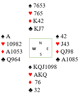 Og hva har vest om han i tillegg til trumfesset som han allerede har vist også har det ruteresset som må sitte der, og også kløver ess som han må ha hvis det er riktig å legge kløver konge i tredje stikk? I så fall har vest tre ess = 12 honnørpoeng. De aller fleste åpner alltid med 12 poeng. Vest passet, altså har hun nesten helt sikkert ikke kløver ess hvis hun har det ruteresset som det er en forutsetning at sitte der hvis utgangen skal kunne vinnes.