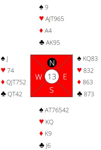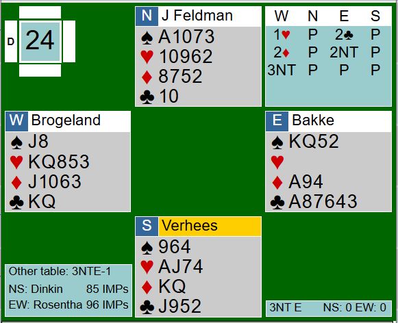 Fire par meldte og vant storeslem i hjerter (2210) etter spar konge i utspill (et sted kom ruter ut). De noterte +104 av +108 oppnåelige poeng. Det var så en lang rekke med tretten stikk i 6 hjerter (1430), og de fikk +80. Noen fikk tolv stikk i 6 hjerter, og det ga faktisk strø over middels å spille 4 hjerter med tretten stikk (710), tilsvarende strø under middels for kun tolv stikk og +680.