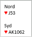 Nord spiller ut hjerter 3, norsk fordeling. Syd stikker med esset og spiller hjerter 6 tilbake. Hva legger du fra hånden?