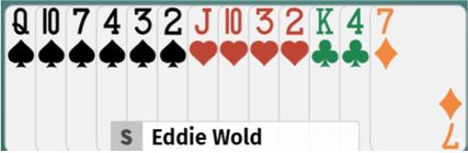 Vinnerlagets nord spilte altså 4 spar og fikk også ruter ut fra øst til kongen og esset. Spillefører tok to kjappe kløveravkast på de to godspilte ruterstikkene. Så trumfesset og mer trumf. Senere tok han dobbelfinesse i hjerter. Da den fargen ga kun en taper ble det elleve stikk, KAPLAN +650.
