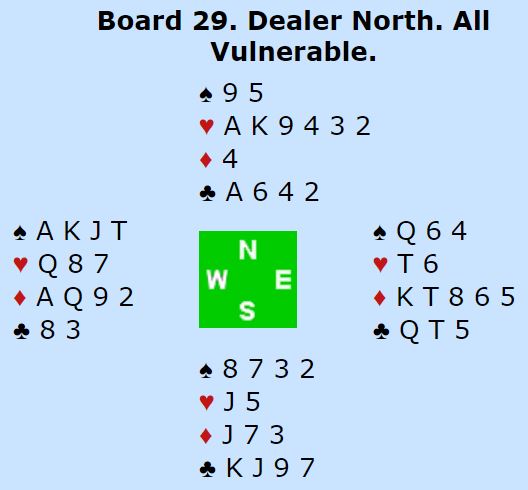 Det er veldig dramatisk dette spillet slik kortene er plassert kan motspillerne med åpne ta fire kløverstikk og seks hjerterstikk, dvs. hente seks doblede bet i 3NTx! Da må de få med seg kløverstikkene, og syd må spille hjerter knekt som effektivt smadrer tieren og ruller opp spilleførers hjerterkombinasjon. Seks bet ville gitt -1700. Men da nord forsøkte å godspille hjerteren sin fikk i stedet Helgemo ett stikk i den fargen og ni stikk i spar og ruter, dvs. ett doblet overstikk og +950 – en viss forskjell...