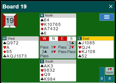 Syd spilte ut hjerter. I denne utgangen kunne det nok blitt mer enn en bet, men Norge fikk i alle fall tak i beten og noterte +100. Så spillet ga 4 IMP til Norge.