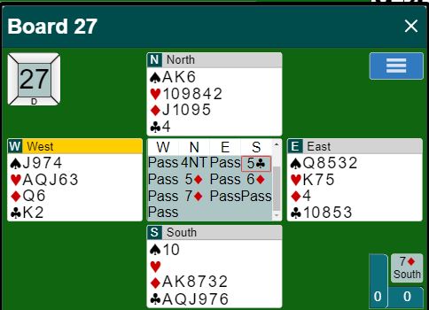 Før det du ser av meldingsforløpet her hadde syd åpnet med 1 ruter og nord støttet til 2 ruter etter 1 hjerter innpå, og øst støttet hjerteren. Kløverfargen ble raskt godspilt, ingen store problemer, +1440. Godt gjort å finne frem til storslem etter en sånn start!