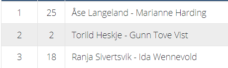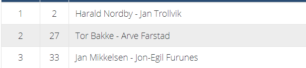 I Monrad Par spilte 82 par. Tor Eivind Grude-Christian Bakke (Sømna/Bergen AK) vant. Disse kom på pallen: