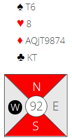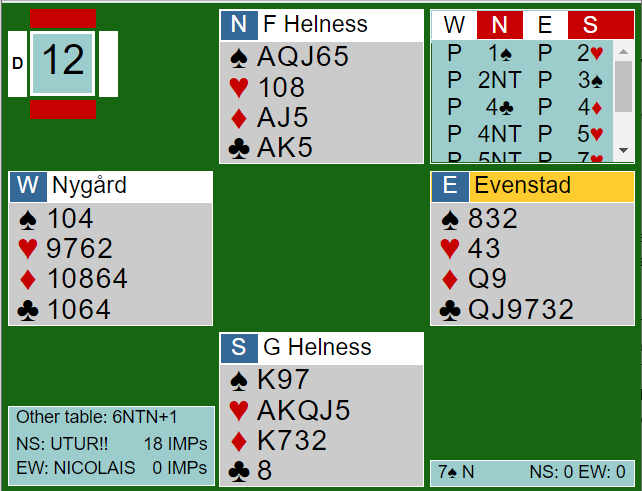 Ved noen bord der nord åpnet med 1 ruter var øst med i meldingene. De som var i utgang i grand fikk stort sett tak i tolv stikk, noen tok alle stikkene. Hvis du er i 3NT og får spar ut kan det bli bet i utgang om ruterfinessen går galt, mens det står i 6NT hvis den finessen lykkes!